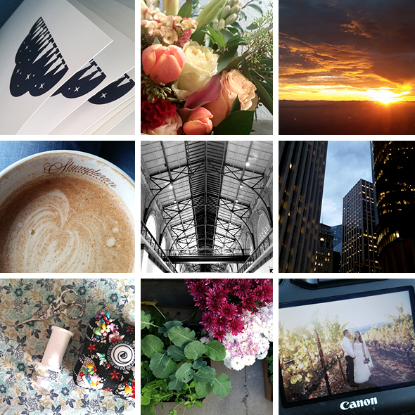 Top to bottom, left to right: Screen printing holiday cards for my Etsy shop / Celebrating four years of marriage / Sunset from airplane windows / Stumptown Coffee in Portland, OR / Ferry Building in San Francisco, CA / Night lights after freelancing in San Francisco, CA / Sewing! / Growing! (Both edibles and pretty flowers) / Last wedding of the season at a winery in Fairfield, CA