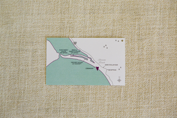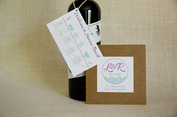 For Laura and Ryan, I worked on additional items to make their guests feel loved & welcomed at the event. My favorite piece is part of the welcome package for guests. Since many guests were coming from out of town and staying the entire weekend, Laura and Ryan put together some goodies and delivered them to the guest’s rental houses. This included a weekend itinerary, a cd with some songs special to the couple and a map of the local area. See the original wedding invitation set here: http://www.fayechamplinstudio.com/wedding-invitation-laura-ryan/