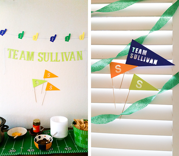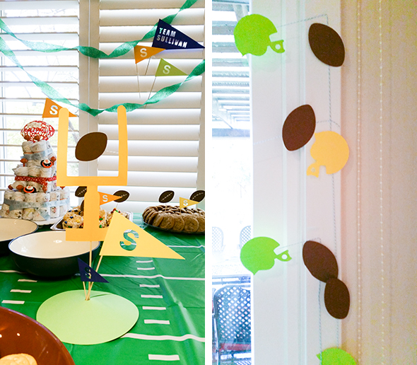 This couple are big football fans and have a due date very close to the Super Bowl, so a co-ed football themed shower was a great choice for them. I had a lot of fun designing a whole new set of items for this theme and definitely ran with the ball – ha! There wasn’t one team to be rooting for, so I went with bright colors and lots of greens for the playing field itself.