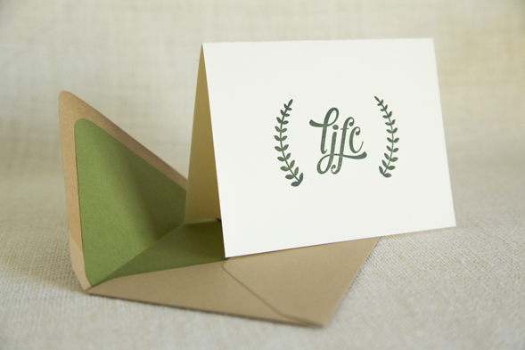 Now for the printing details. All items were hand-pulled on a vintage Adana Press. This set was letterpress printed in two custom PMS inks (dark green and dark gray) onto Ecru Crane’s Lettra paper and a Kraft Colorplan Envelope (lined with French Pop-Tone paper).